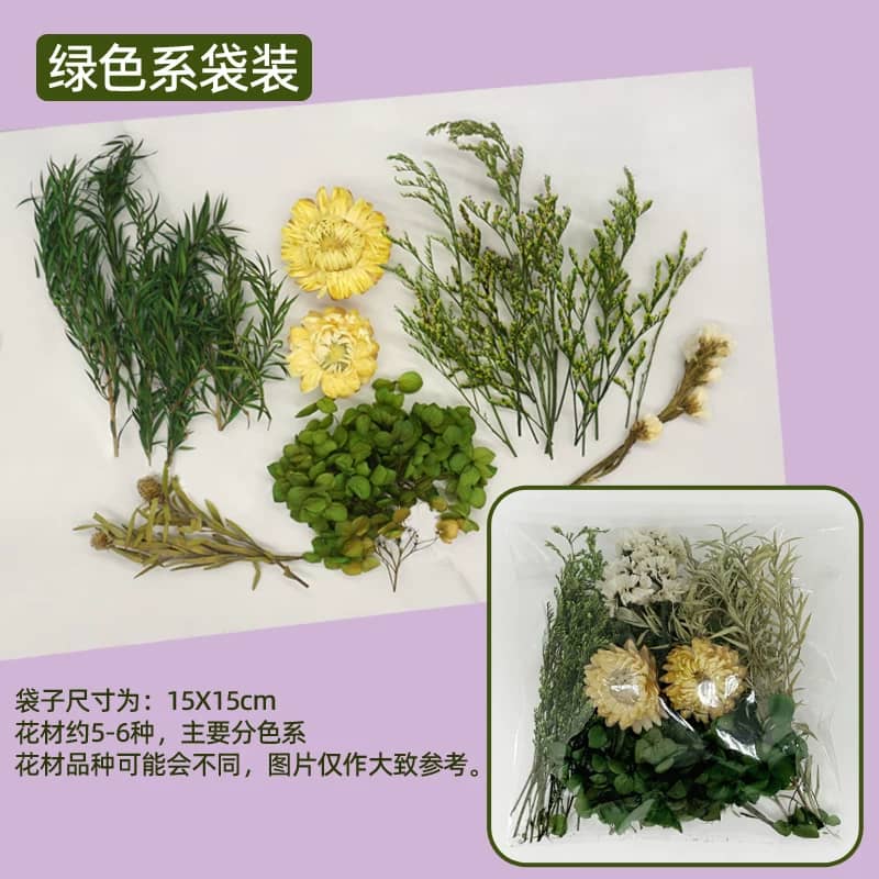 Chaque sachet contient environ 5 à 6 variétés de fleurs cueillies et séchées avec soin, offrant une palette de textures et de nuances pour des créations uniques et durables.